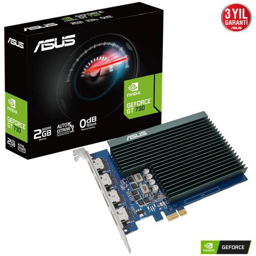 Asus GeForce GT 7304 HDMI yuvası ve pasif soğutması ile birlikte ASUS GeForce GT 730, çoklu monitör kullanımını ve sessiz çalışmayı aktif hale getiriyor.